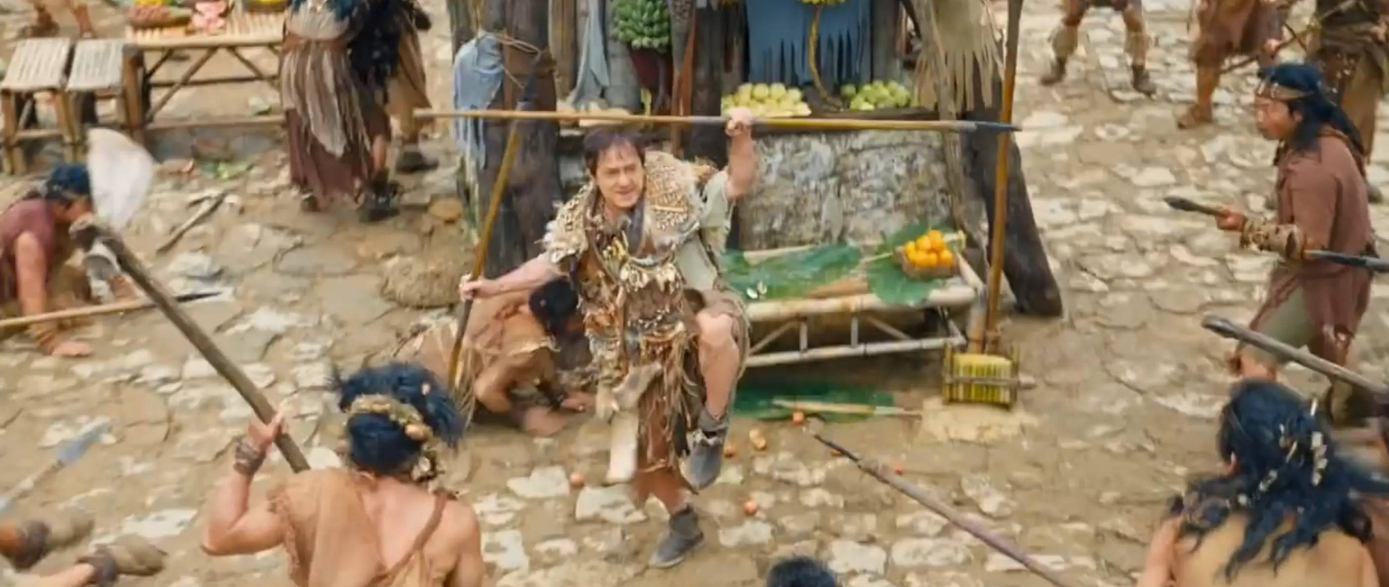 而成龙大哥,显然不是像《过家家》里那样躺平,原始部落的设定,让他的谐趣功夫有更多发挥空间,翻滚、跌落、掉水坑,用自制的原始武器打出招牌动作,这些都少不了。